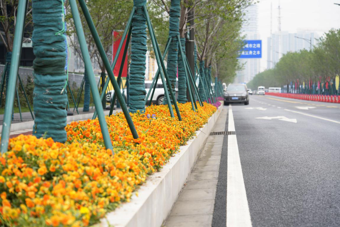 鳳滁路沿線種植了大量的櫻花樹(shù),到了陽(yáng)春三月,櫻花盛宴吸引了眾多市民前來(lái)觀賞。靚麗的綠化分隔帶,采用了各種顏色搭配的三色堇、 歐石竹等植物,打造精致靚麗的視線焦點(diǎn)。層次感鮮明的立體式綠化分布綠色的草皮、大游行爬墻扮靚圍墻。