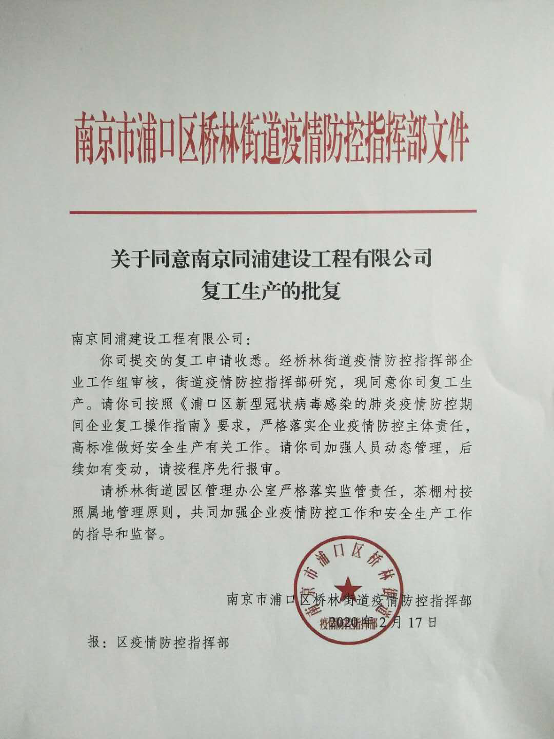 在同力建設領導的關心指導下,同浦公司魏強董事長親任同浦公司防疫工作領導小組組長,同浦公司總經(jīng)理徐雪華任副組長,自2月2日起,按照屬地政府橋林街道園區(qū)辦的復工政策要求,全面組織準備各項防疫物資、復工申報材料,2月10日正式提交復工申請。經(jīng)多方努力跟進,2月17日,同浦公司取得復工批復,為茶棚工業(yè)園區(qū)第一家復工企業(yè)。